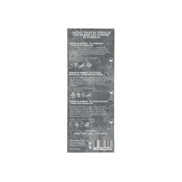 Tasty Grapes Moments wijnproeverij in box inclusief quote "Congrats!" met 3 rPET 100 ML tubes met wijnen van Domaine de Rombeau. De proeverij bestaat uit een rosé (12,5% vol), rode (14,5% vol) en witte wijn (13,5% vol). Een strak en internationaal cadeau voor elke felicitatie.