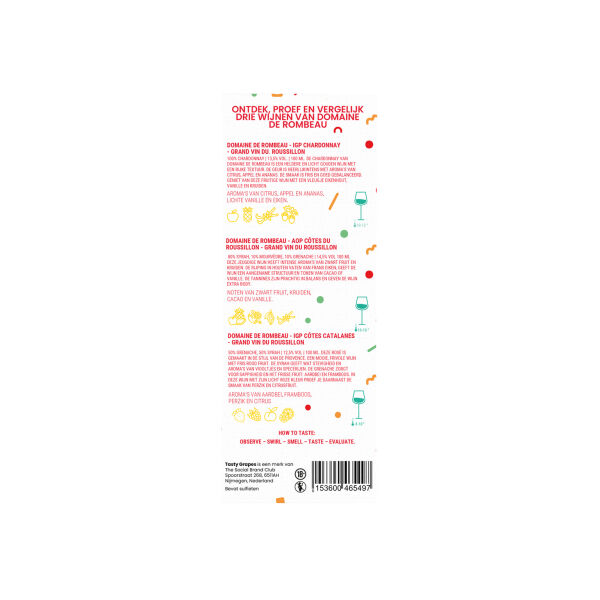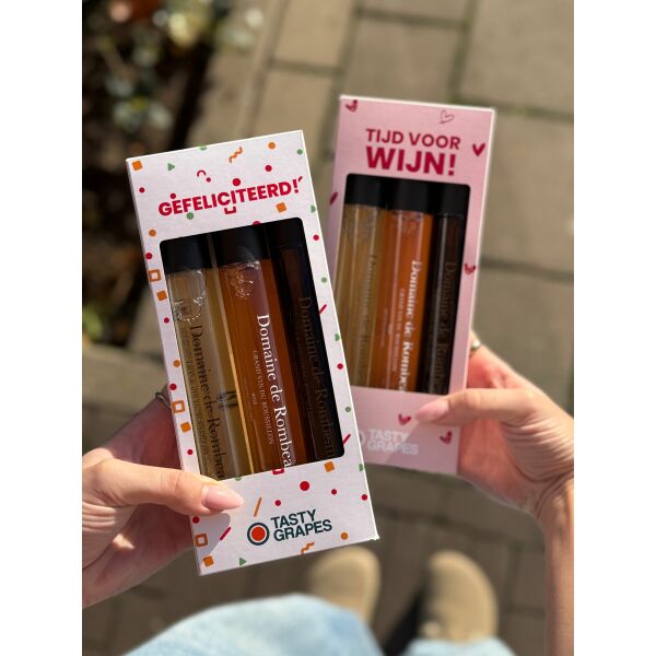 Tasty Grapes Moments wijnproeverij in box inclusief quote "Gefeliciteerd!" met 3 rPET 100 ML tubes met wijnen van Domaine de Rombeau. De proeverij bestaat uit een rosé (12,5% vol), rode (14,5% vol) en witte wijn (13,5% v…