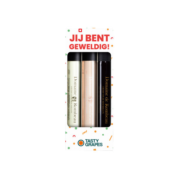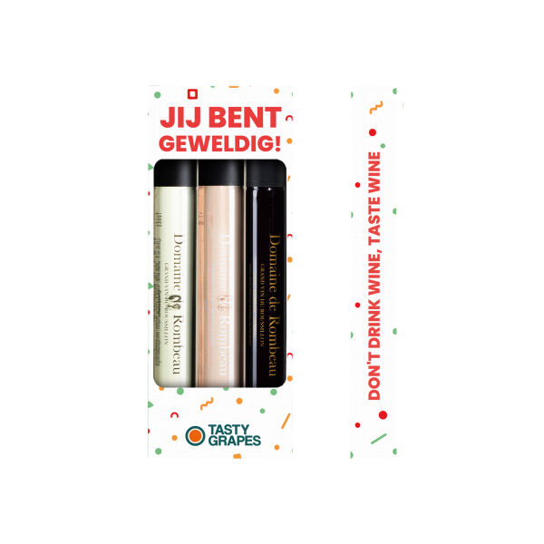 Tasty Grapes Moments wijnproeverij in box inclusief quote "JIj bent geweldig!" met 3 rPET 100 ML tubes met wijnen van Domaine de Rombeau. De proeverij bestaat uit een rosé (12,5% vol), rode (14,5% vol) en witte wijn (13,…